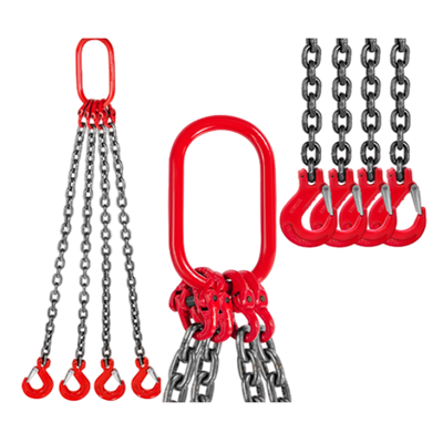 اسلینگ زنجیر چند شاخه، شامل مدل‌های سه شاخه و چهار شاخه، برای بلند کردن و جابه‌جایی بارهای سنگین و ناپایدار طراحی شده است. این اسلینگ‌ها به‌ویژه در محیط‌های صنعتی و پروژه‌های ساختمانی که نیاز به توزیع یکنواخت بار و افزایش ایمنی در هنگام بلند کردن بار وجود دارد، کاربرد دارند. با تعداد شاخه‌های مختلف (سه یا چهار شاخه)، این اسلینگ‌ها امکان توزیع بهتر فشار را فراهم می‌آورند.