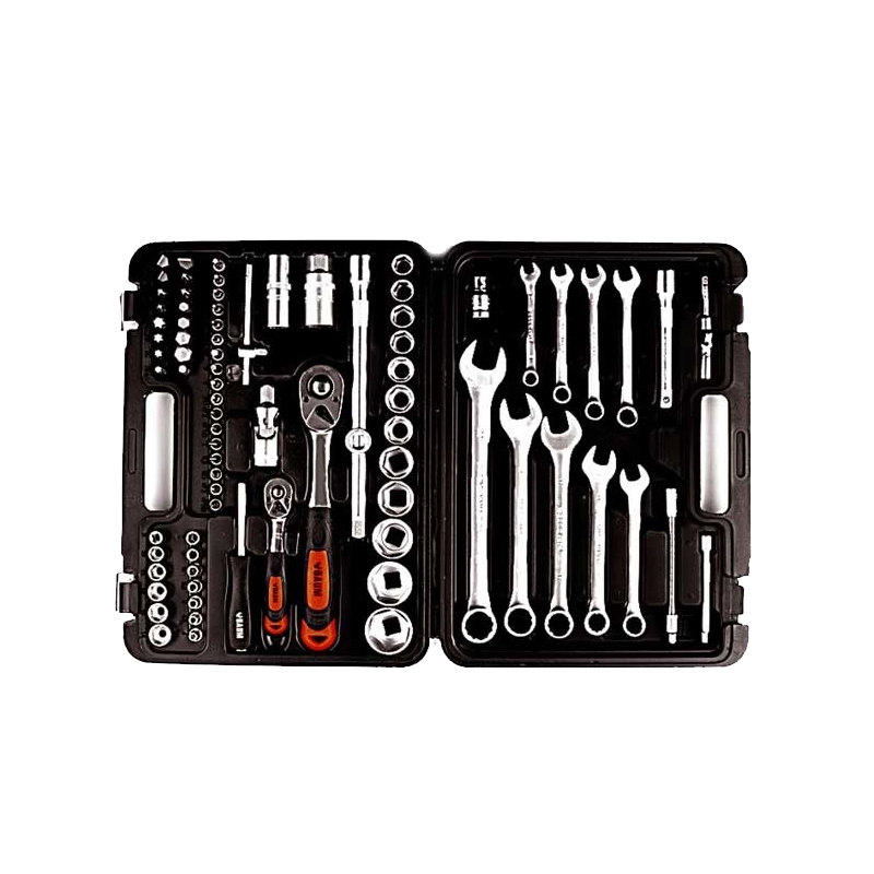 تنوع ابزار: شامل بکسهای سایز ۱/۴ و ۱/۲، آچارهای تخت و رینگی، انواع سرپیچگوشتیها، آلنها و رابطها.