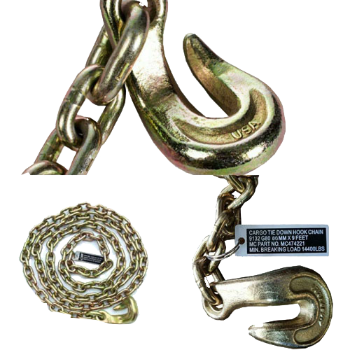 این زنجیر با قلاب کج، امکان اتصال سریع و آسان به انواع تجهیزات جابجایی را دارد. به دلیل انعطافپذیری و ایمنی بالا، در کنار جرثقیلها، وینچها و بالابرها به کار میرود. نحوه استفاده آن به صورتی است که قلاب در قسمت انتهایی زنجیر به نقطه بار یا سطح مورد نظر متصل میشود و اتصال مستحکمی فراهم میکند.